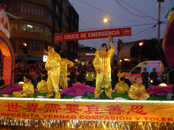 以清新,高洁的莲花为主题,彩车两端镶着彩云上的飞天模型,被秘鲁人称之“带来好运的中国天使”(Angel),第一次以这种方式展现在南美洲秘鲁民众的眼前。车上四个孩子在安静的打坐,四位法轮功学员做着平和舒展的四套法轮功功法,亮丽的金黄中式炼功服,柔和动作给民众留下深刻的印象,博得一阵一阵热烈的掌声。“真善忍”,“法轮大法好”,“世界需要真善忍”已打进人们的脑海中。