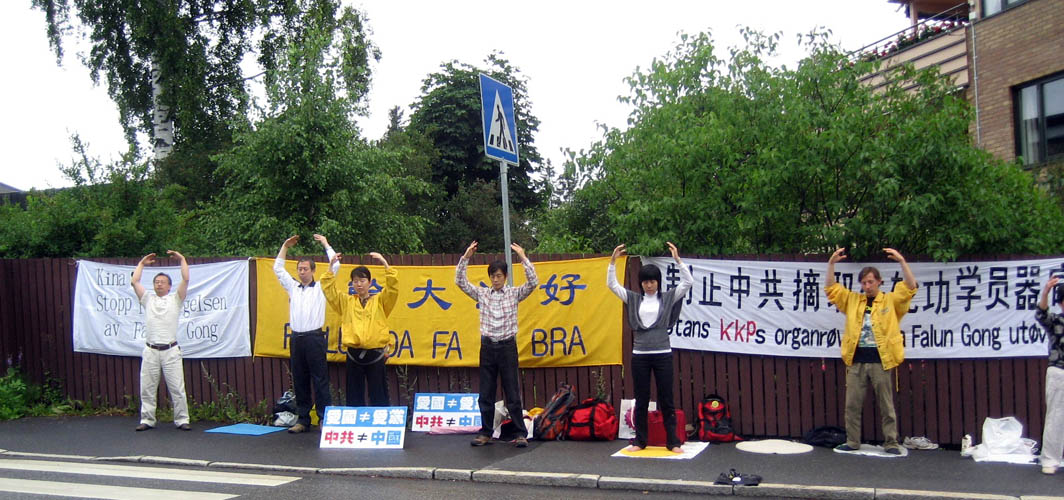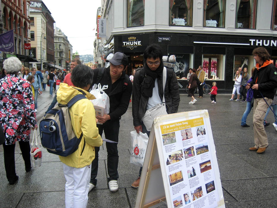 二零一零年七月二十日一大早,挪威首都奥斯陆上空就淅淅沥沥地下起了小雨,八点左右,雨越下越大,但无论怎样,都不能阻挡法轮功学员反迫害、救度众生的坚定信念。