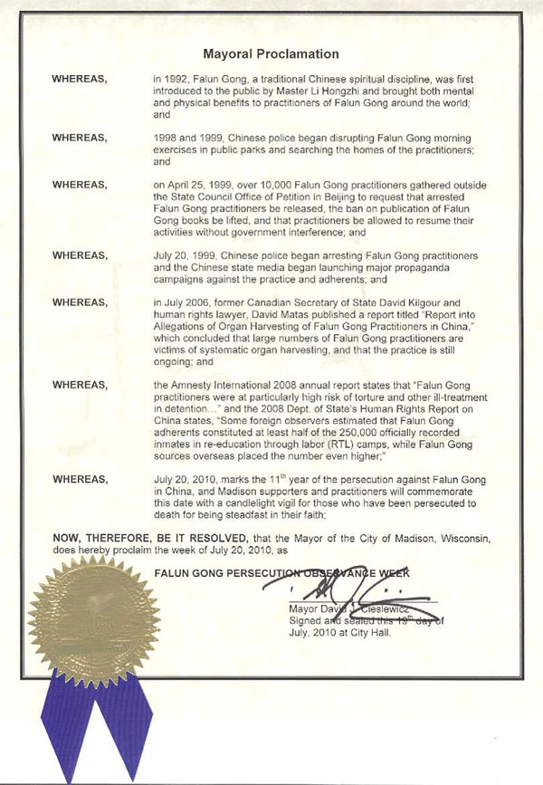 因此,威斯康星州麦迪逊市市长宣布,二零一零年七月二十日这一周为“关注法轮功受迫害周”。