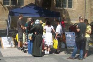一对德国夫妇和他们的孩子也停下了脚步了解法轮功,并且在签名簿上签了名字。这名德国妇女这几天正心情不好,学员向她介绍法轮功可以解除人的压力,并且炼功可以让人安静下来,是最好的调节身心的方法。她听过之后很感兴趣,准备尝试一下。还有一名德国妇女一直在寻找让心灵安静的方法,见到法轮功学员特别高兴,不断询问这个功怎么炼,在哪里炼等问题,当得到了法轮功的资料后如获至宝。
