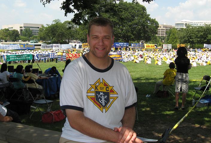 他认为法轮功的信仰“真善忍”是普世的价值,“在矛盾和冲突面前,如果人都能象他们那样的克制宽容,这世界就不会有暴力。这么热的天,这么多男女老幼来到这里为他们的信仰,为制止迫害而努力,实在可贵、可敬!”