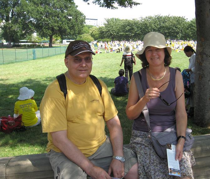 今天是圭吉夫妇从法国巴黎来华盛顿度假的第一天,在国会山前,为优美的炼功音乐和法轮功学员的宁静氛围所吸引,他们坐在炼功场旁,久久不愿离去。“天很热,我们很享受他们带来的宁静。”