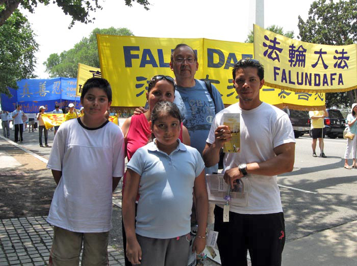 来自墨西哥的明戈(Miguel)全家观看了游行,他拿着手中的传单对记者说:“上面写着‘真、善、忍’,这是非常好的东西,现在的世界需要这个。不明白为什么在中国会受到迫害。他们这个团体现在这种形式很好,能让更多的人知道,让更多的人一起来制止这场迫害。我们全家都会与他们站在一起。”