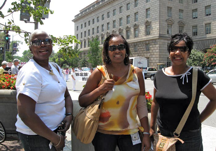 两位黑人女士,看到“悼念被中共迫害致死的法轮功学员”方阵时,哭了起来,其中一位流着泪说:我们为他们感到悲痛,这是不应该发生的。我们会支持他们,需要善良的人都能起来一起制止这场迫害,就一定会成功的。”