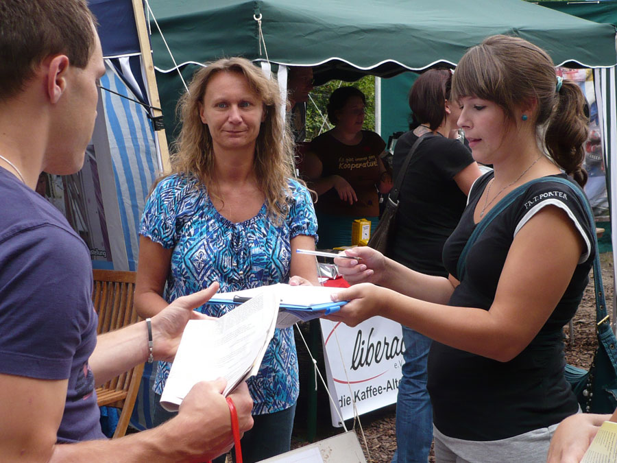 ![]() 法轮功学员在对卡尔斯鲁尔城市节日的游人们在讲真相 |