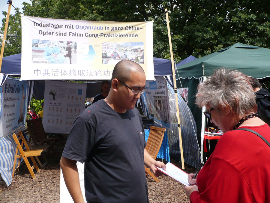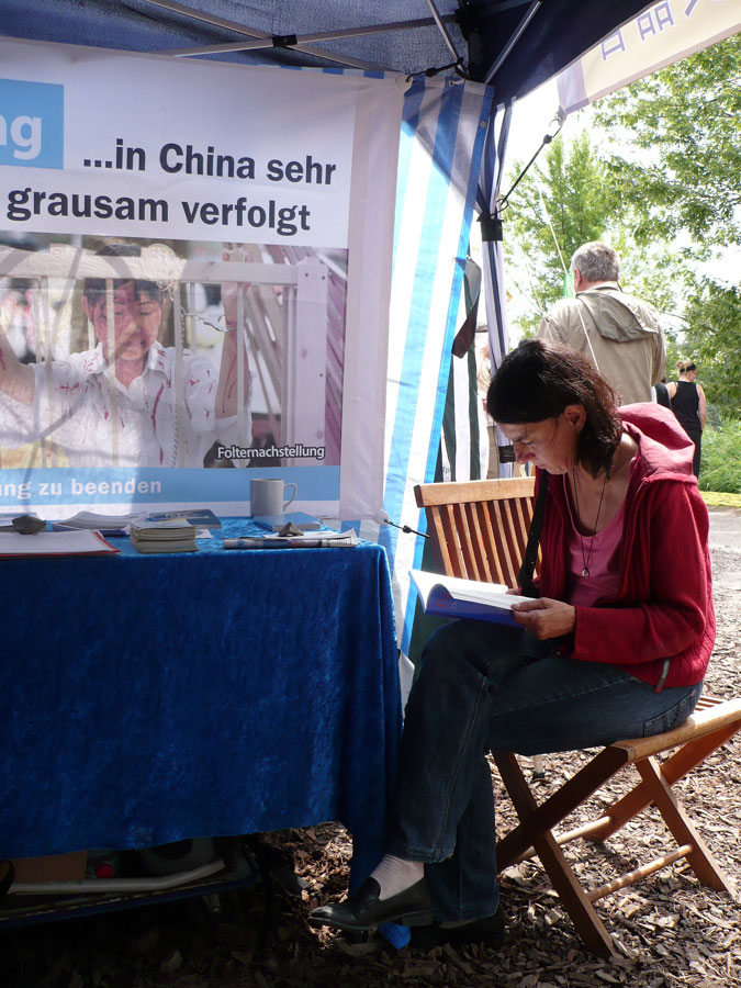 一位从附近城市赶来游玩的德国女士听完法轮功真相后,就坐在桌子前安安静静地看起《法轮功》来。她问了很多“为什么”和“是什么”的问题之后,跟随法轮功学员学了炼功动作。她在法轮功展位一共停留了好几个小时,最后离开时,她说,自己回家后会继续炼功的,还要上网去查更多信息。