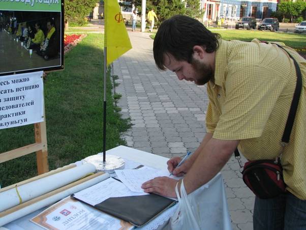 二零一零年七月二十三日,在位于西伯利亚的俄罗斯联邦哈卡斯共和国(Respublika Hakassia)首府阿巴坎(Abakan),法轮功学员举行了和平抗议活动。横幅和展板上的图片和文字向市民们讲述着修炼法轮大法的美好,揭露中共迫害的邪恶。得知真相的正义人士纷纷在声援簿上签名,呼吁立即停止对中国大陆法轮功学员的迫害。
