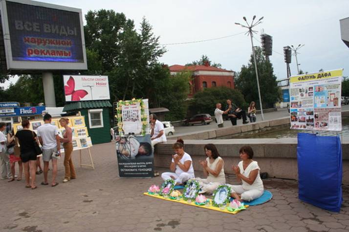 七月二十日,部份法轮功学员在东西伯利亚第二大城市伊尔库茨克(Irkutsk)市中心摆上展板,向市民揭露中共十一年来对法轮功学员的残酷迫害。