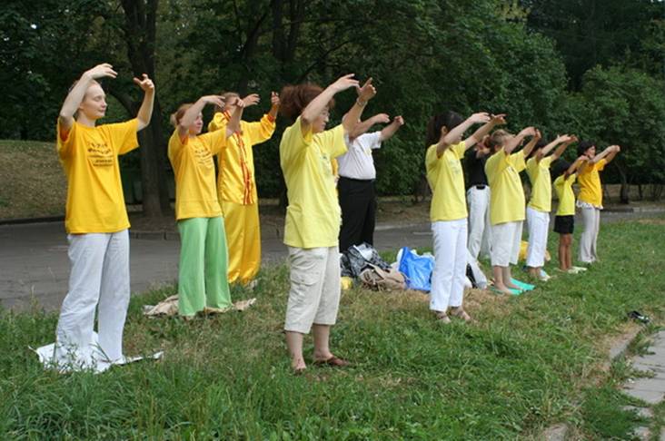 ![]() 在莫斯科中使馆前的湖对面炼功 |