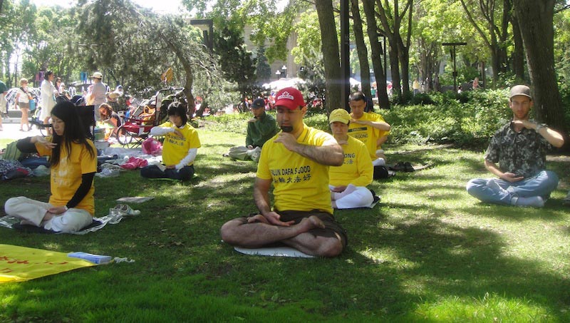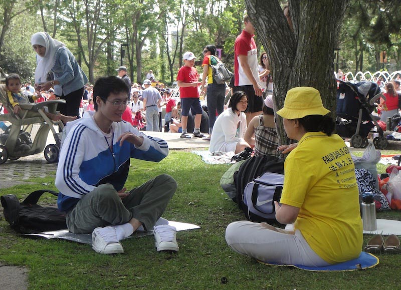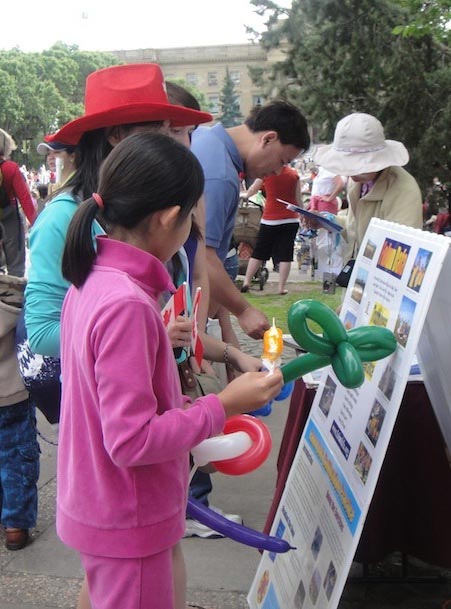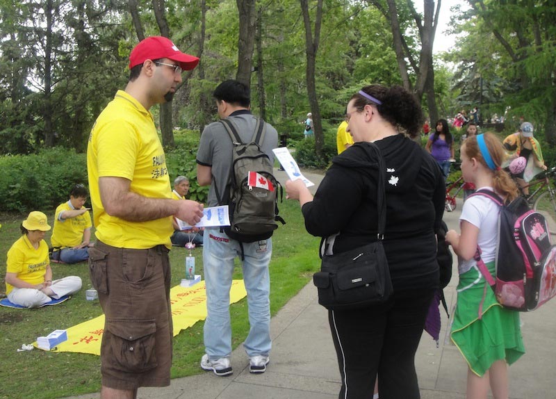 二零一零年七月一日,埃德蒙顿法轮功学员们早早来到活动场地旁的草坪上,摆好横幅和展板,开始炼功并向经过的人群发放真相资料,介绍这个以“真善忍”为原则的传统修炼功法。熙熙攘攘走过的人们祥和的音乐、柔和舒缓的炼功动作所吸引,驻足观看。周围的喧嚣嘈杂与这里的宁静怡然形成鲜明的对比。人们无法理解如此平和的功法在中国会受到迫害,无法理解竟然会有人因为打坐和炼功而被当局折磨致死。许多人询问如何学习法轮功,不少人当场就跟着学炼起来。很多的小朋友被学员们手中印有“法轮大法好”的精致小莲花所吸引。学员赠送莲花时教孩子们念“法轮大法好”,拿到莲花的孩子和大人们都露出了愉快的微笑。