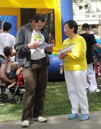 华人社区在议会大厦前组织的文艺庆祝活动吸引了很多华人前往观看。法轮功学员向他们分发真相资料和《九评共产党》光盘,告诉他们不要再受到中共谎言的欺骗。很多华人高兴地接过资料,有六位华人当场让学员登记退出邪党团队。也有不明真相的华人带着疑惑同学员交谈很久,表示回去后会好好思考。