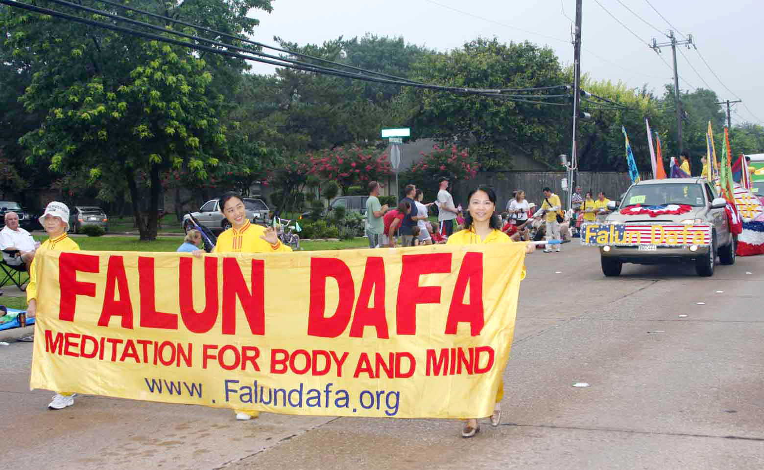 法轮功学员的队伍是由三名女学员举着的黄底红字写着“FALUN DAFA”“Meditation for Mind and Body”的大型横幅走在前面,她们面带微笑,宁静、祥和。紧接着就是法轮功学员精心设计和装饰的花车,其以美国独立日兰、白、红为主题设计的框架,加上象征圣洁、美好的各色莲花。花车上几位身着金黄色炼功服的学员演示舒缓、优美的法轮功五套功法,构成一幅优美的画面。