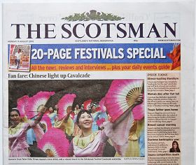 “中国人照亮了爱丁堡艺术节大游行!”这是二零一零年八月九日苏格兰第一大报《苏格兰人报》在头版头条位置对今年爱丁堡艺术节大游行上的法轮功团队的描述。