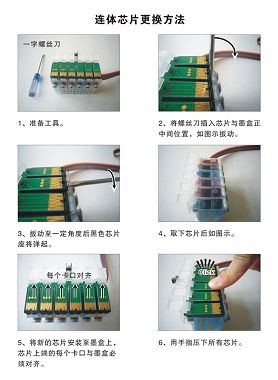 1、在大量打印前先按连供芯片的复位键操作一次,恢复所有墨水量,基本上可以避免了“墨尽退纸”的现象出现。但这种方法不是适用于所有的芯片。