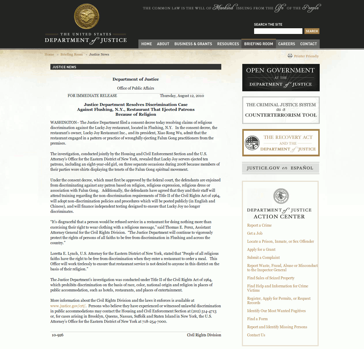 美国司法部在其网站上公布了对纽约法拉盛的十里香菜馆歧视法轮功学员的指控所做出的裁决