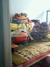 一间十多平方的房间,放一块大木板,看墙上的号数是十个人睡觉的木板,但整整关了十七个人,连躺下的地方都无。恶警每天晚上揪出四个人坐在水泥地上,叫值班,每两小时换一批人,虽然这样,他们也不会给你睡好觉。每个房间都装上监控器,装有大喇叭,恶警在值班室,通过监控器看到各房间的举动情况,就在大喇叭里大声的用粗言烂语叫骂,搞的不得安宁。这十五天里吃的不是人吃的,每天只有一小塑料桶水,我动作慢,总是让别人先拿,经常水都没得喝。里面没有条件洗衣服、冲凉,大冷的天,只有一个水龙头,十多个人吃拉睡在一起,恶劣的环境使很多人都病倒了。我也出满了一身红点,非常难受。这期间还要经常找谈话,恐吓。拘留所把我的私人物品收去后,要我买它们的高价商品,挣我们的钱。我们家属送来的衣物、食物他们不收,只收人民币。