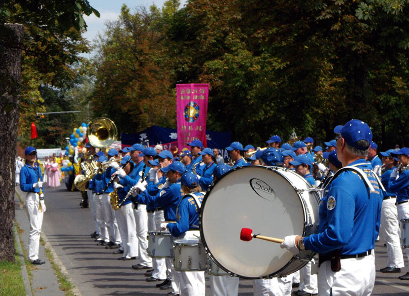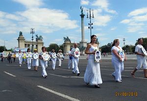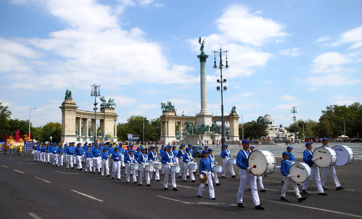 游行队伍由欧洲天国乐团打头阵,演奏了“法轮大法好”,“法鼓法号震十方”,“法正乾坤”,“送宝”,“欢乐颂”等歌曲。随后是舞蹈队、花车、功法表演等。游行从著名的英雄广场(hosok tere)出发,途经中使馆,穿过安德拉斯(andrassy ut)大街,最后到达匈牙利国会。