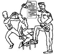 4、摧残性灌食:被长期非法关押的法轮功学员在进行绝食反迫害时,从各种渠道揭露出来的事实统计,在大陆有几十甚至上百的法轮功学员因遭野蛮灌食而导致死亡,更多则引发了各种相关的后遗病症。怎样的野蛮灌食呢?在输食管上擦上不明药物,在鼻孔里来回抽动,同时将很长的灌食管在胃里不停搅动。在灌食过程中,许多人还遭到被灌以高浓盐水、辣椒水、高度白酒、芥末油、石灰、洗涤用品甚至粪便屎尿等进行凌辱、摧残和迫害。甚至有恶警指使犯人以折磨被灌食的法轮功学员为乐,如灌浓盐水后用打气筒向学员胃中打足空气,然后用脚踩学员的肚子以致浓盐水从胃中反喷出来,呛激人的眼鼻、气管,恶警竟以此为乐;还有对失禁要拉肚子的学员强制不让上厕所并将人倒挂在牢房铁门上(见酷刑之五图)