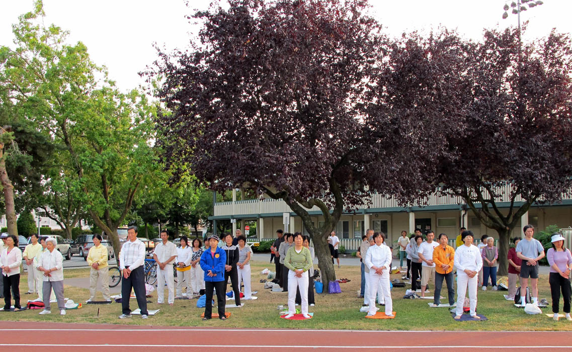 炼功时间是在傍晚的六点到八点,图书馆外面的操场上,有许多人在散步或做其它健身活动。当法轮功炼功音乐响起,祥和的炼功场面和熙熙攘攘的操场形成鲜明的对比。