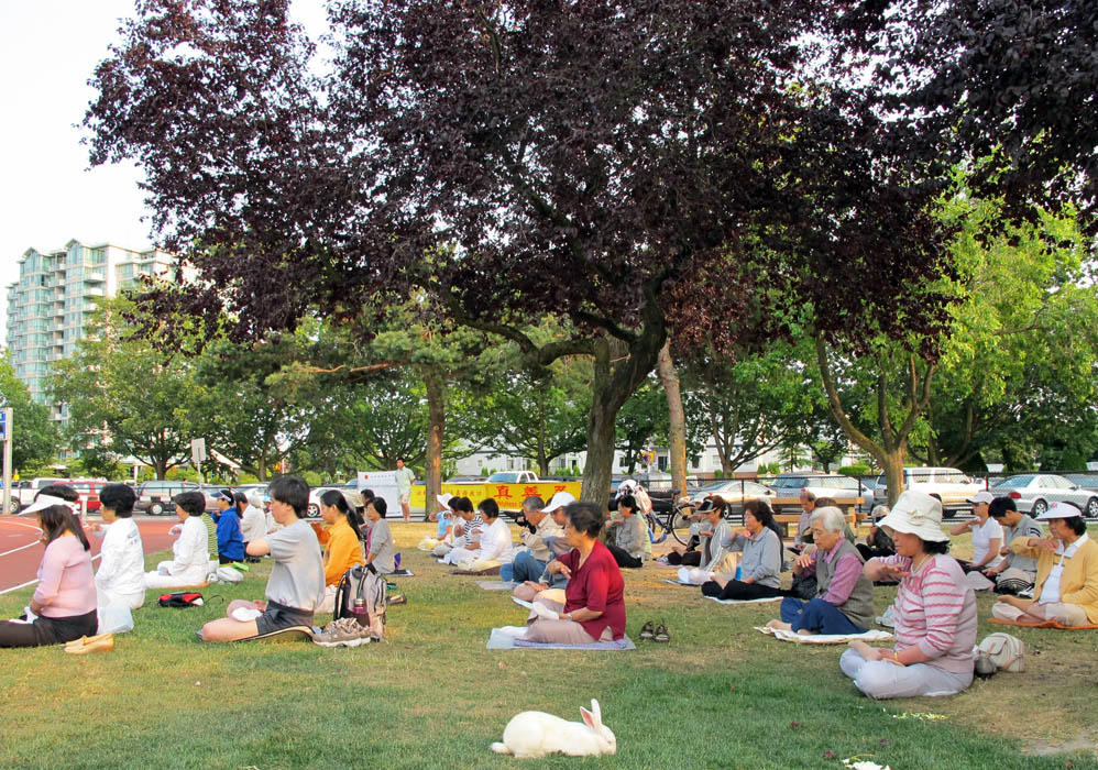 【明慧网二零一零年八月四日】(明慧记者王枚温哥华报导)二零一零年八月二日是加拿大卑诗省节(BC Day),温哥华法轮功学员在华人集中居住的城市列治文(Richmond)公共图书馆外集体炼功。祥和的法轮功炼功场面吸引了人们的关注,也方便了有缘人走进来学炼。