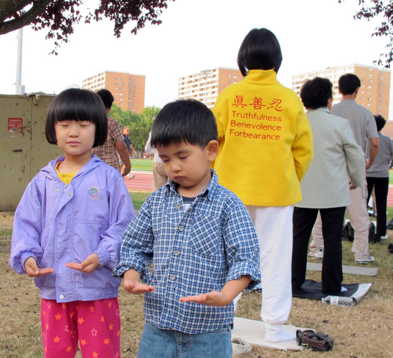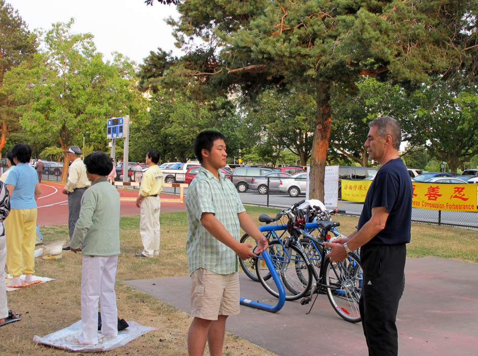 一位不久前从中国大陆来探亲的老太太,久久地站在炼功场一角,专注地看着学员炼功。后来一位学员过去和她交谈,她告诉学员说,她感觉这个场气很强(学员纠正说是能量很强),她原来腰痛得厉害,仅仅在这里看了法轮功简介,在炼功场边上站了一会儿,腰就不痛了。她说过几天要来学功,还说(迫害法轮功的)江泽民太坏了。