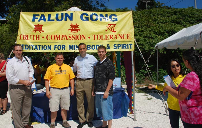 罗州财政部长及州长候选人卡普里奥(左三)和助理访法轮功展位并和学员合影