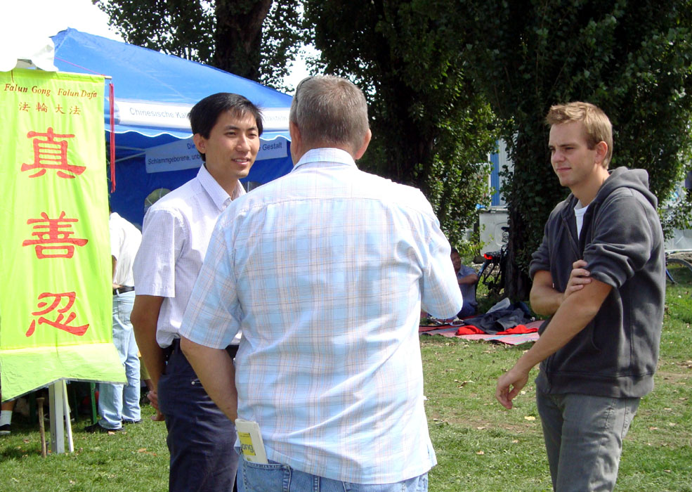 【明慧网二零一零年九月一日】二零一零年八月二十八、二十九日两天,在瑞士首都伯尔尼的BEA展览中心举办的亚洲节上,来自亚洲不同国家、民族的上千人共聚一堂,向瑞士及周边国家的民众展现亚洲风情和文化。在广场舞台边的一片开阔区域,挂着醒目的“法轮大法”和“真善忍”条幅的两顶帐篷,格外引人注目。中心舞台的扬声器里不时传来法轮功《普度》、《济世》祥和动听的乐曲。这是瑞士法轮功学员设立的信息台。