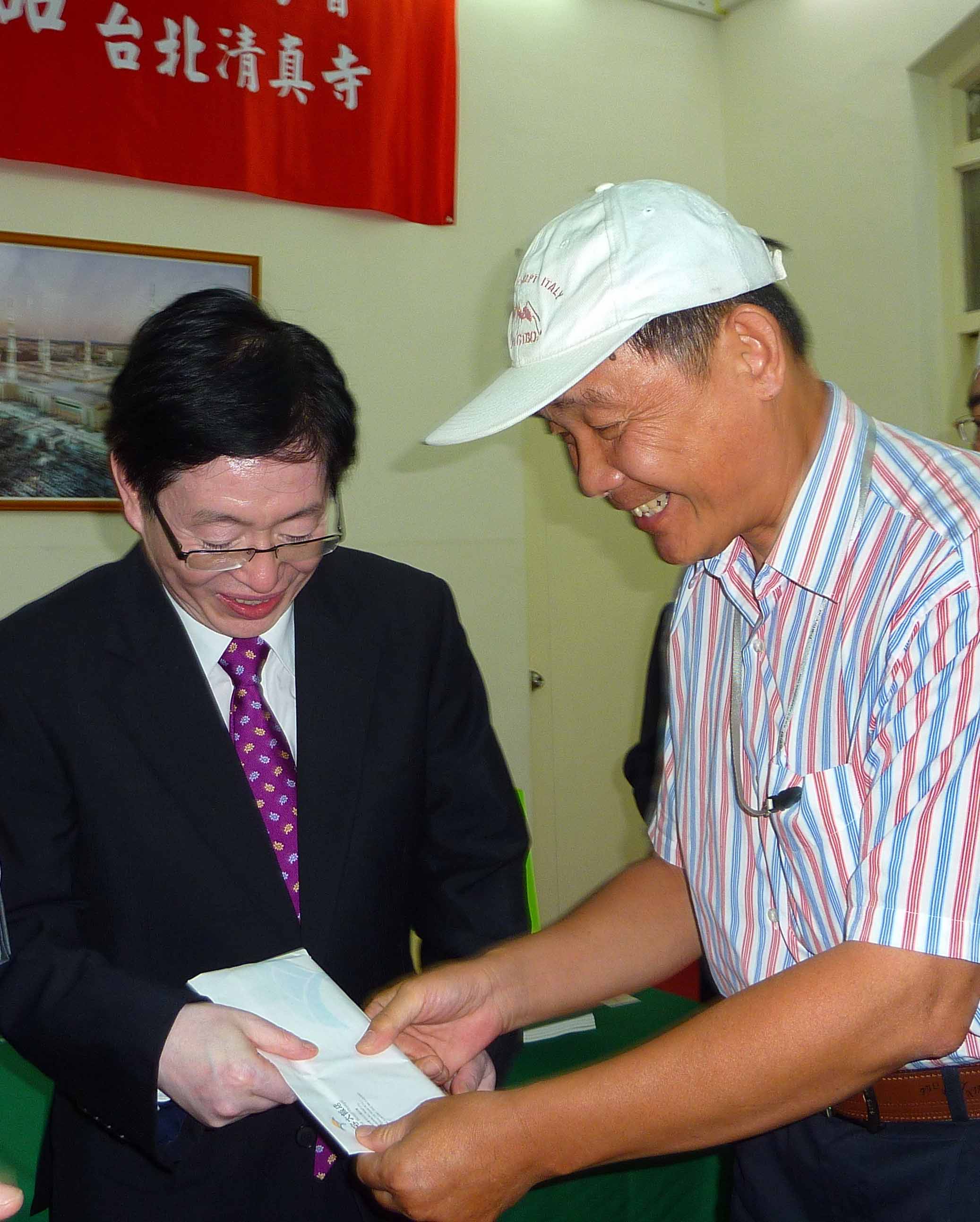 ![]() 中共宗教局长王作安(左)在拜访台北清真寺后,收到法轮功学员(右)送的诉状,王认为是礼物,道谢收下。 |