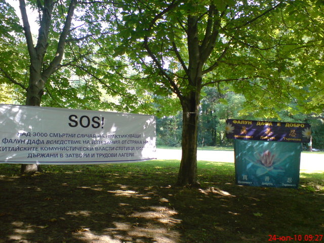 七月二十日这一天,索菲亚市的法轮功学员们还在Serdik的地铁站附近的国家文化宫前,打出了“法轮大法–真、善、忍”;“法轮大法——源于古老中国的身心修炼法门”和“SOS:停止屠杀:制止中共摘取法轮功修炼者器官”的条幅。