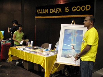 在活动中,法轮功学员为学校的新生热情地介绍功法,并讲述中共对法轮功长达十一年的迫害。很多来自中国大陆的新生也被吸引到展位边聆听法轮功学员的介绍并取阅法轮功真相资料和光盘。