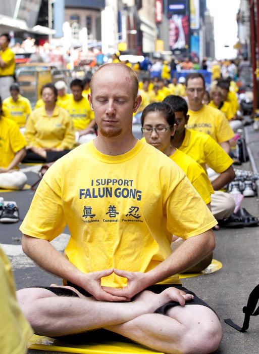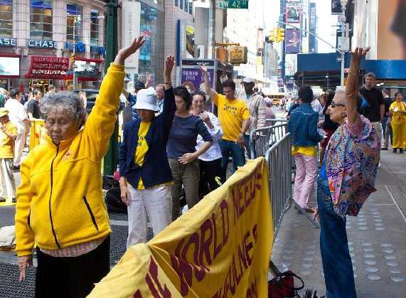 二零一零年九月四日上午,来自世界各地的法轮功学员,在纽约时代广场的第七大道上,从四十二街至三十九街间进行了法轮功功法演示。六百多名修炼者在一片喧嚣中表现得祥和从容,吸引了来自世界各地的游客和纽约人的注意,舒缓优雅的炼功动作令人们纷纷驻足留影、问询,还有的停下来直接跟着学。
