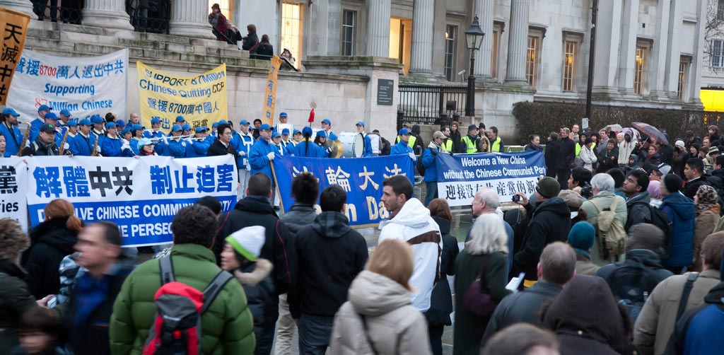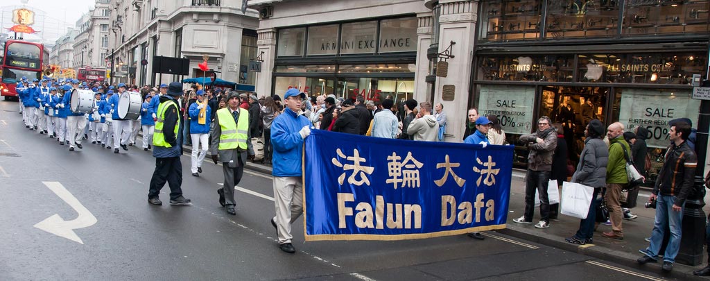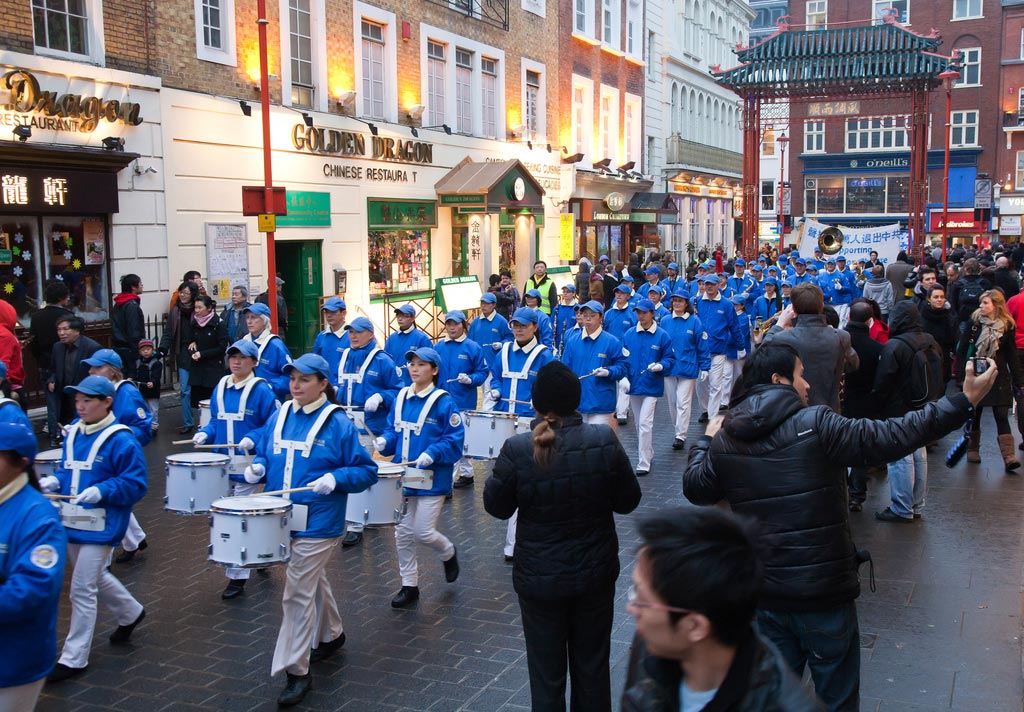 圣诞——新年节日期间的伦敦市中心人山人海,熙熙攘攘的人群川流不息。游行队伍途经伦敦著名的高档购物街牛津街、摄政街和皮卡迪里广场,然后行至伦敦唐人街,最后来到著名的鸽子广场。在游行队伍的行进途中,天国乐团多次在繁华街道的人流密集地带停留演奏了很长时间。乐团演奏的嘹亮乐曲马上吸引了正在进行节日购物的人们,人们纷纷用手中的摄像机、照相机和手机记录着眼前发生的一切。很多人停下脚步站在路边观看游行队伍打出的横幅和标语,包括“声援八千七百万勇士退出中共”、“解体中共制止迫害”以及“迎接没有共产党的新中国”等,一些人接到介绍退党大潮真相传单后立即认真阅读起来。很多西方民众是第一次看到这些信息,但他们表示赞同。