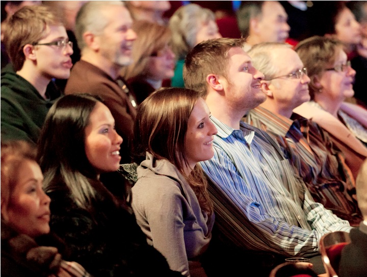 ![]() 二零一一年一月二十一日神韵巡回艺术团在底特律的第二场演出,观众被逗趣的小和尚引来阵阵笑声。 |