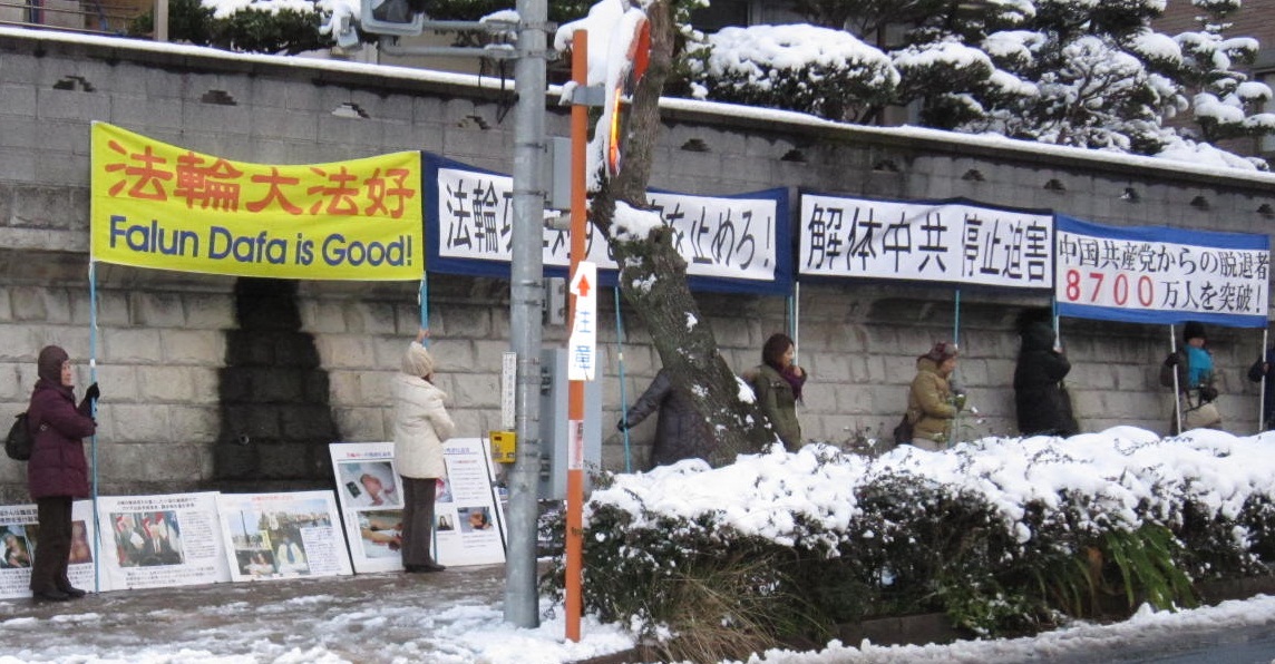 因受北方强冷空气的影响,日本列岛以西日本和北日本为中心下了一场从未有过的暴雪,导致高速公路全线封闭。在极恶劣的气候的情况下,法轮功学员们远绕山路安全抵达了长崎中领馆前。