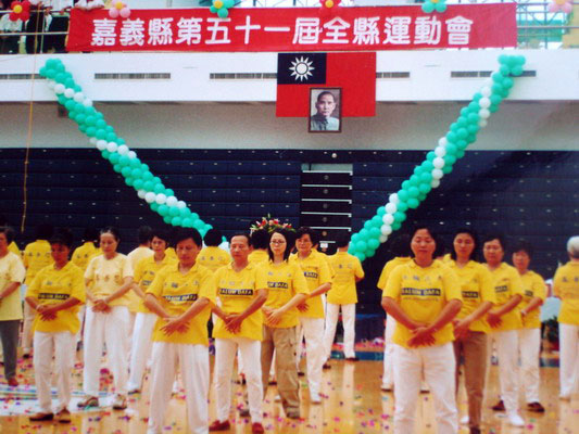 ![]() 图:在嘉义县运动会上演示法轮功功法 |