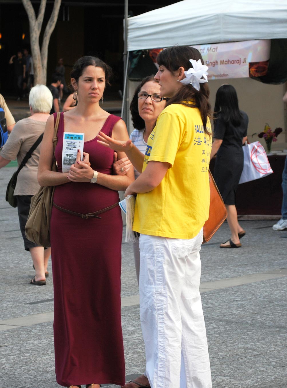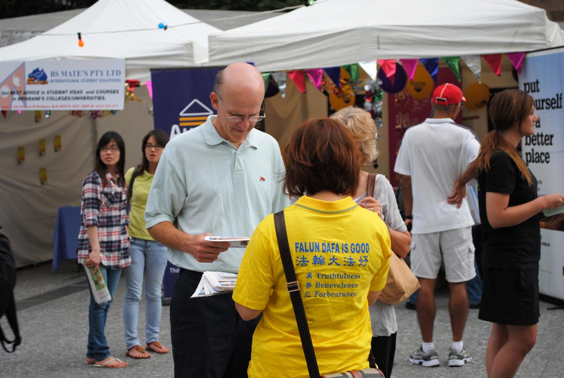除了表演获得如雷的掌声之外,一整天法轮功展位前的人潮更是络绎不绝。法轮功学员丹尼(Daniel)表示:“我们今天在开放的市政厅广场上(设摊位),很多人有了这个机会来了解法轮功到底是什么,并且阅读了相关的资料。”他希望澳洲的民众都能认同“真、善、忍”理念,祝愿他们拥有美好光明的前程。