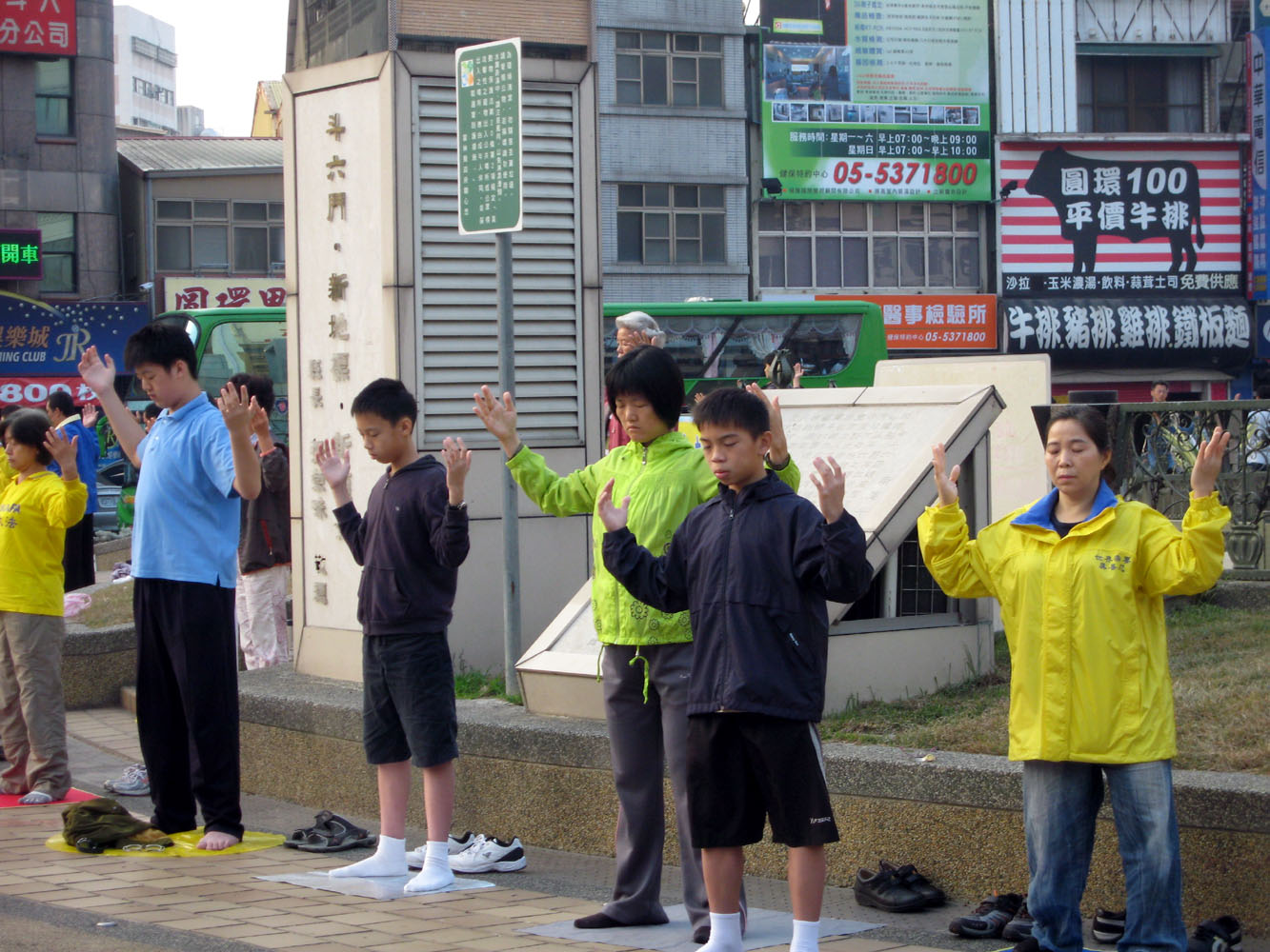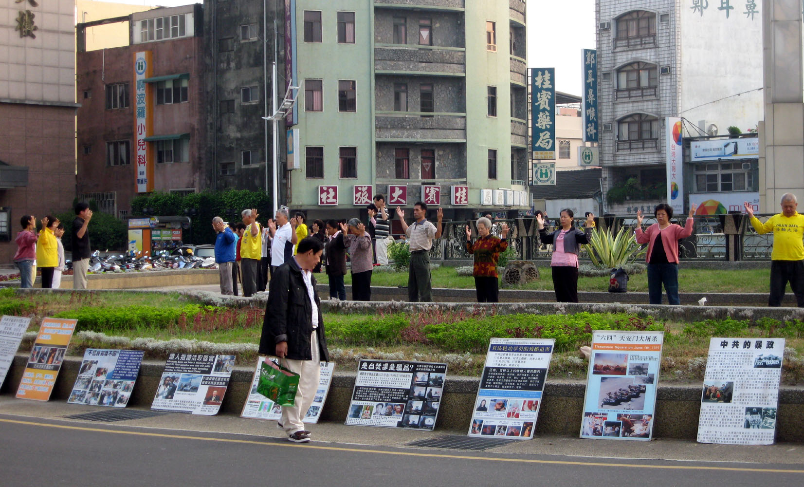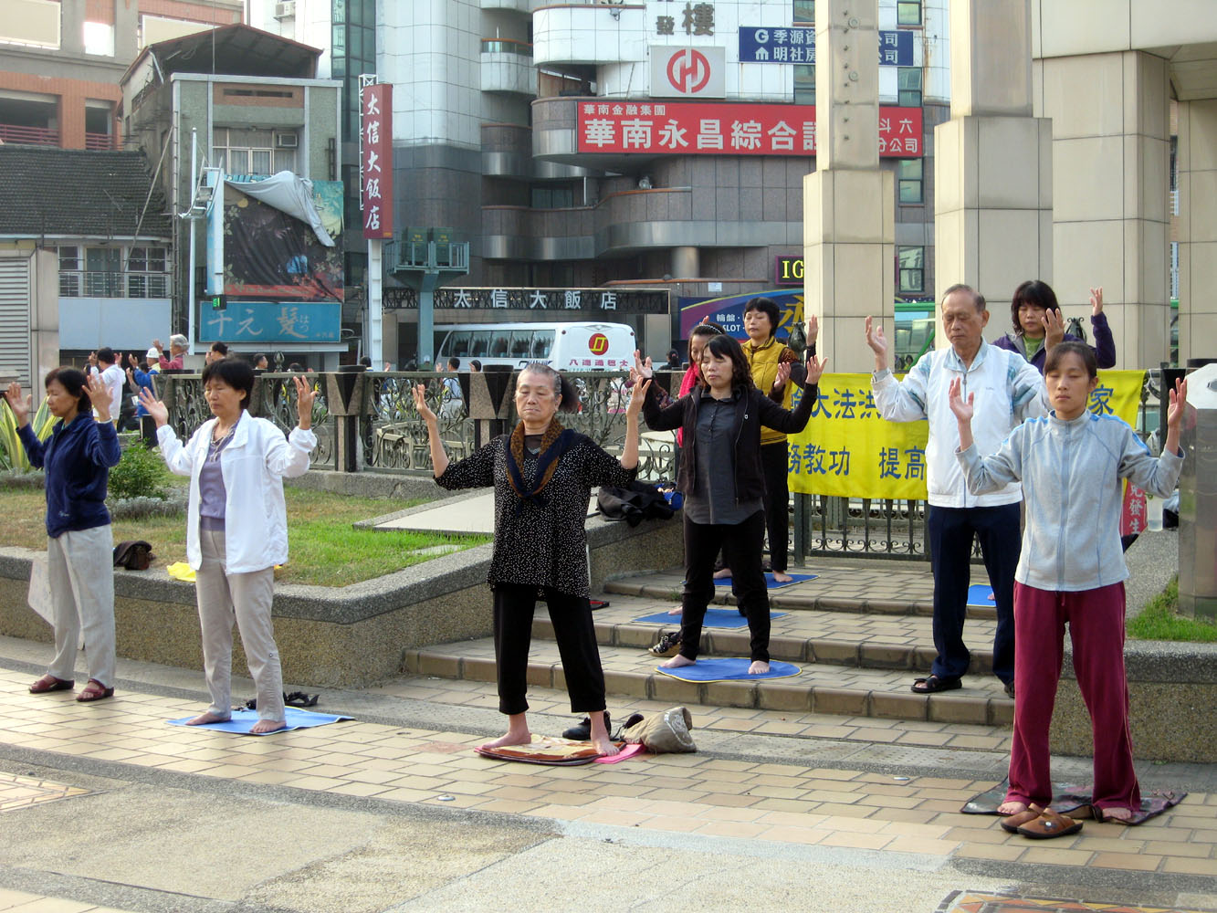 二零一一年十月二十三日清晨,法轮功学员在斗六圆环集体炼功的情形。