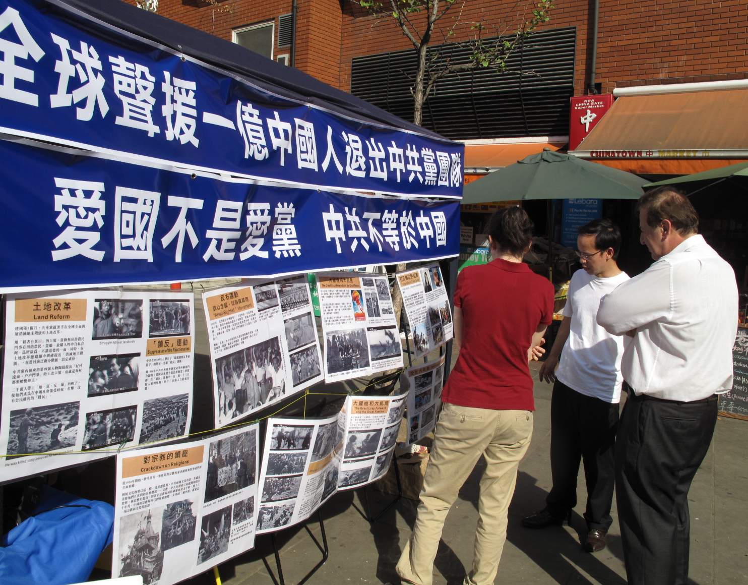 当天的活动也引起了很多当天来到唐人街的西方人士和游客的兴趣,他们当中一些人花较长时间认真阅读接到的关于“三退”的真相传单,有些人认真观看展出的真相展板,在荷兰银行工作的伦敦人斯蒂文先生就是他们其中的一位。