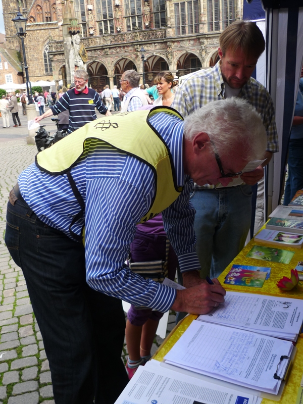 【明慧网二零一一年十月六日】二零一一年九月十日,德国北部城市布莱梅(Bremen)的多个协会、组织和活动家们,通过“布莱梅要为人权而积极努力”的活动,向公众介绍关注人权的重要性。法轮功学员作为参加此活动的二十五个团体之一,在布莱梅城中心的广场上摆设信息台,揭露中共对法轮功(又称法轮大法)长达十二年的残酷迫害