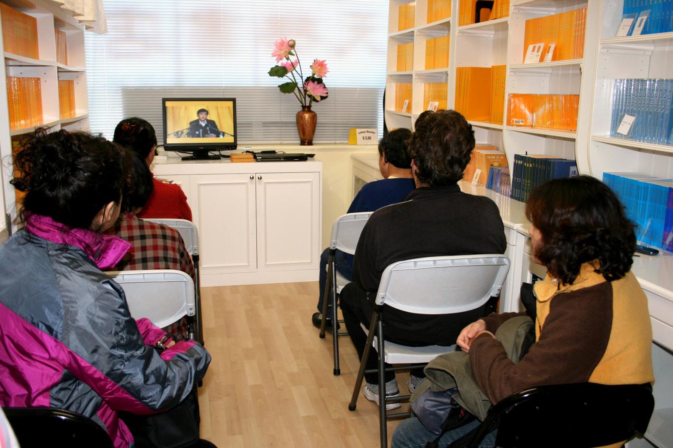 邝先生在书架上拿出一本《转法轮》,接着说:“就是这本书。我回家一看,欲罢不能。看完第一章,我就拍着自己的头说:‘李大师,您是对的,我是错的。’再往后看,越看越激动,我要了解法轮功!赶快找法轮功的人。我记得唐人街上有人发传单,第二天正好是星期六,我在丹打士路口拿到了法轮功的资料,根据上面的信息,上了明慧网,还和多伦多一位法轮功学员通了电话,她要我来天梯书店买书。我来买书时,店员告诉我要听师父讲法,所以我就来了。”
