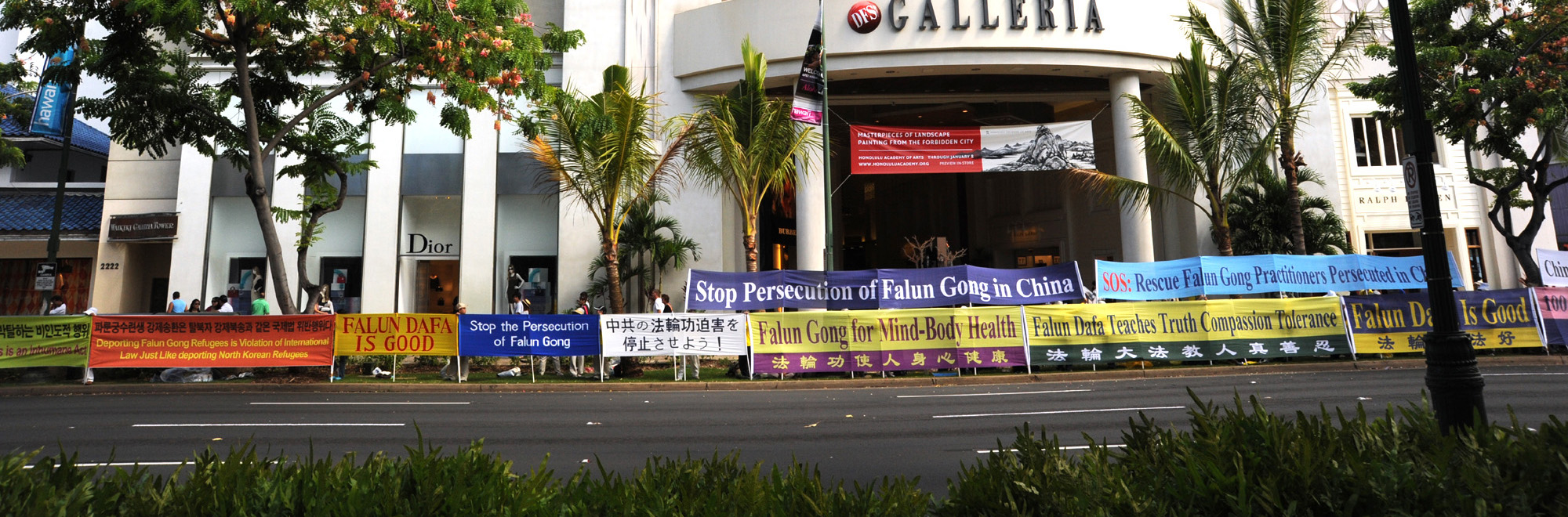 檀香山的威基基(Waikiki)是游人集中的地方,参加APEC会议的各国代表团就住在附近的各个高级酒店里。法轮功学员展开横幅,告诉路人:法轮大法好,法轮功教人真、善、忍,让人身心健康;但在中国正受到中共迫害;他们呼吁世人帮助营救在中国被非法关押的法轮功学员,制止虐杀,制止迫害。