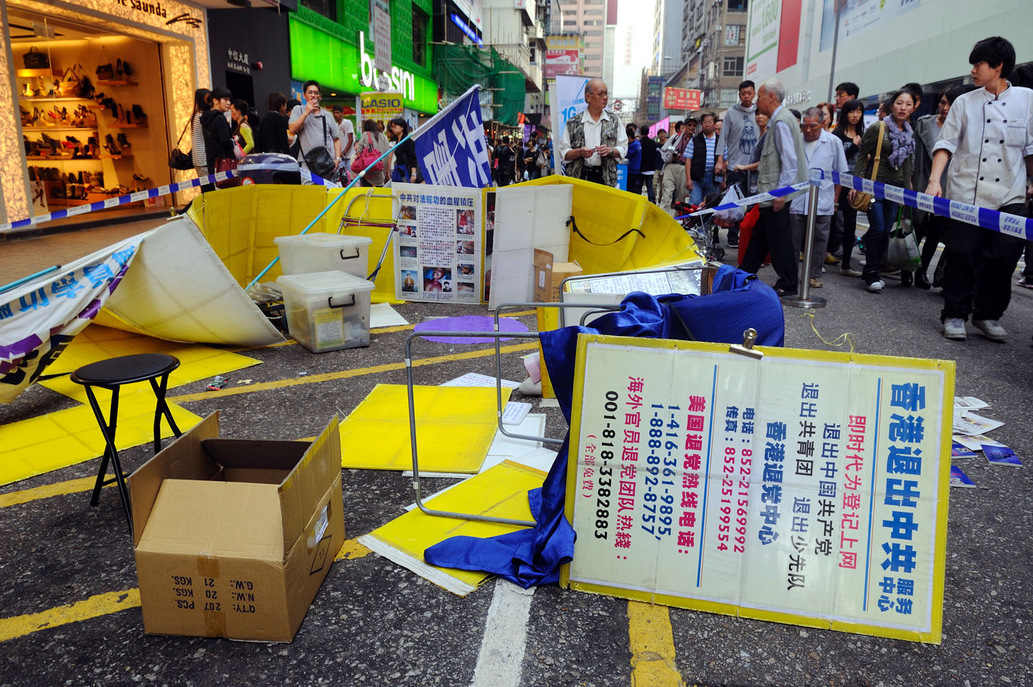 【明慧网二零一一年十一月十六日】(明慧记者唐恩综合报道)香港法轮功学员在旺角街头设置的真相点及退党服务点,二零一一年十一月十三日接连两次遭到暴徒蓄意破坏,警察已将凶徒拘捕。法轮功学员强烈谴责中共雇凶逞恶,敦促港府查明真相,将罪犯绳之以法。许多议员和民众也纷纷谴责中共输出暴力,严重损害香港的核心价值。