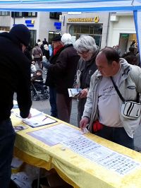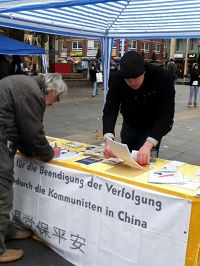 一位德国老先生在征签簿上签名反迫害后,表示很憎恨中共迫害法轮功,并且跟学员交谈了许久。他去过中国很多地方,如北京、上海、苏州、西安和昆明等地。他说自己非常热爱中华文化,并且能够感受到中华文化的伟大,只恨自己没有学中文。当学员谈到中共对中华传统文化的破坏时,老先生紧接着说:“我知道文革,这是它们干的最愚蠢的事情之一。”