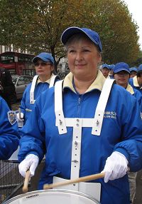 玛丽昂作为天国乐团的鼓手参加过很多次法轮功游行。图为二零一一年十一月五日在伦敦