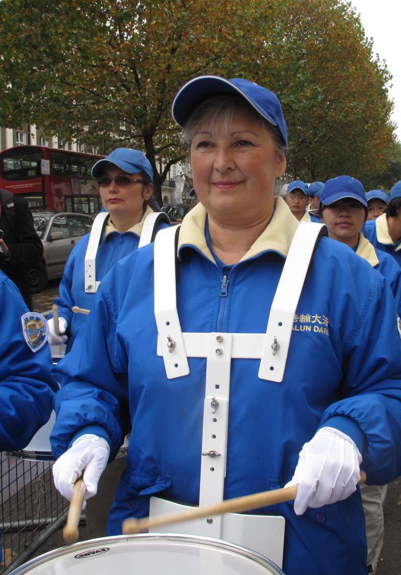 就在几个星期前,十一月五日星期六,玛丽昂还参加了在英国伦敦举行的法轮功大游行,队伍穿过唐人街,天国乐团开道,鼓乐声引起了人们极大的兴趣。玛丽昂一路上总是面带微笑,她希望不会中文的她能够通过自己的精神面貌把法轮功学员善良的一面表现给唐人街的中国人看,让他们看到“法轮大法好”。
