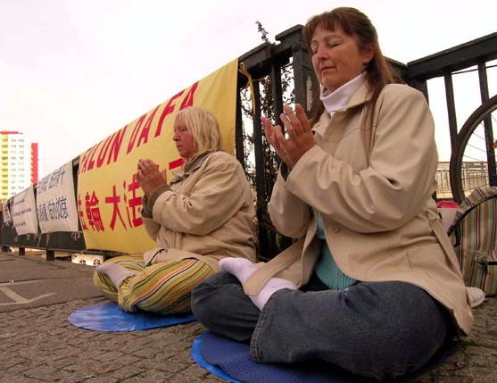 一九九七年底开始炼法轮功后不久,玛丽昂就开始每周六和周日上午去柏林的一个公园里炼功,她负责拿录音机,放炼功音乐,她还把一个介绍法轮功的横幅绑在路边的一棵大树上,旁边再放一些传单,让路过的人能够很方便地拿到。
