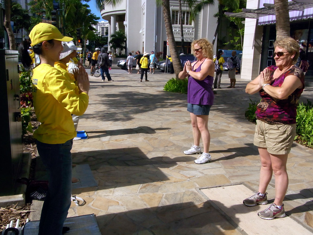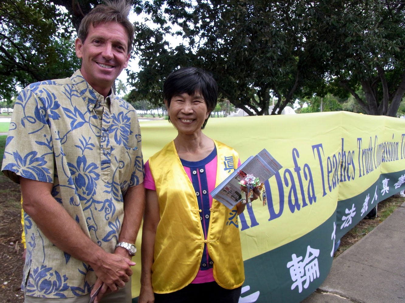 加州法轮功学员辛希亚(Cynthia)说,这是她第一次到加州以外的地方参加讲真相的活动,许多民众听到法轮功在中国遭受长达十二年的迫害时都感到非常不可思议,也有一些人当场想要学炼法轮功。辛希亚表示,一百多位来自台湾的法轮功学员和其他来自日本、韩国、瑞士、加州的学员,虽然大家都来自不同的国家,但都表现得相当有秩序,和夏威夷学员形成一个整体,是一次非常难忘的经验。辛希亚说:“通过讲真相,我接到很多人的反馈,认同我们的做法,并且给予很多鼓励。更有许多人已经看过媒体的报导,直接走上前来表示支持我们。”