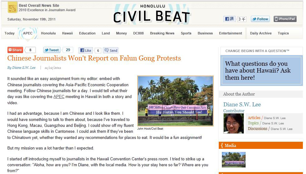 夏威夷网络新闻媒体Civil Beat在APEC会议期间共报导了三则关于法轮功的新闻,其中一篇更以《中国记者不会报导法轮功抗议行动》(Chinese Journalists Won't Report on Falun Gong Protests)为题,描述该记者在夏威夷国际媒体中心与中国记者的对话,所有来自中国的媒体记者都提到“在中国,新闻是受中共政府监控的。报导法轮功议题是被禁止的,如果报导中说错话,随时会丢掉工作。”