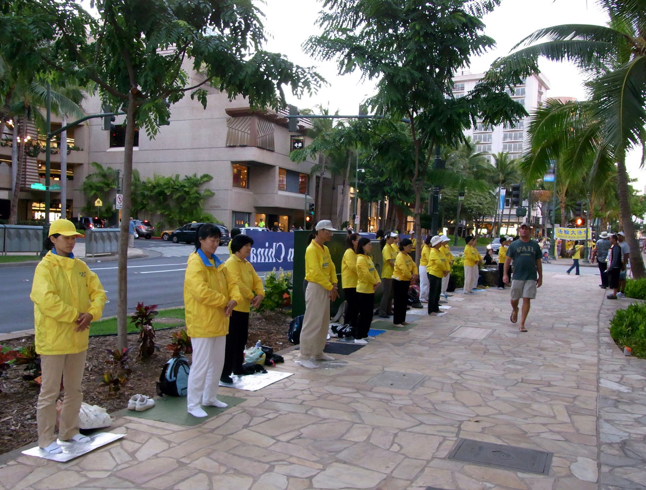 十二日的傍晚,法轮功学员在威基基的街道上集体炼功。当炼功音乐响起后,优美祥和的音乐吸引许多人围观,有的模仿、有的摄影。法轮功学员集体炼功的画面,成了夏威夷夜晚的一个美丽风景。有些人看到这么美好的功法,按捺不住,从对面的街上的跑过来,当场学炼。