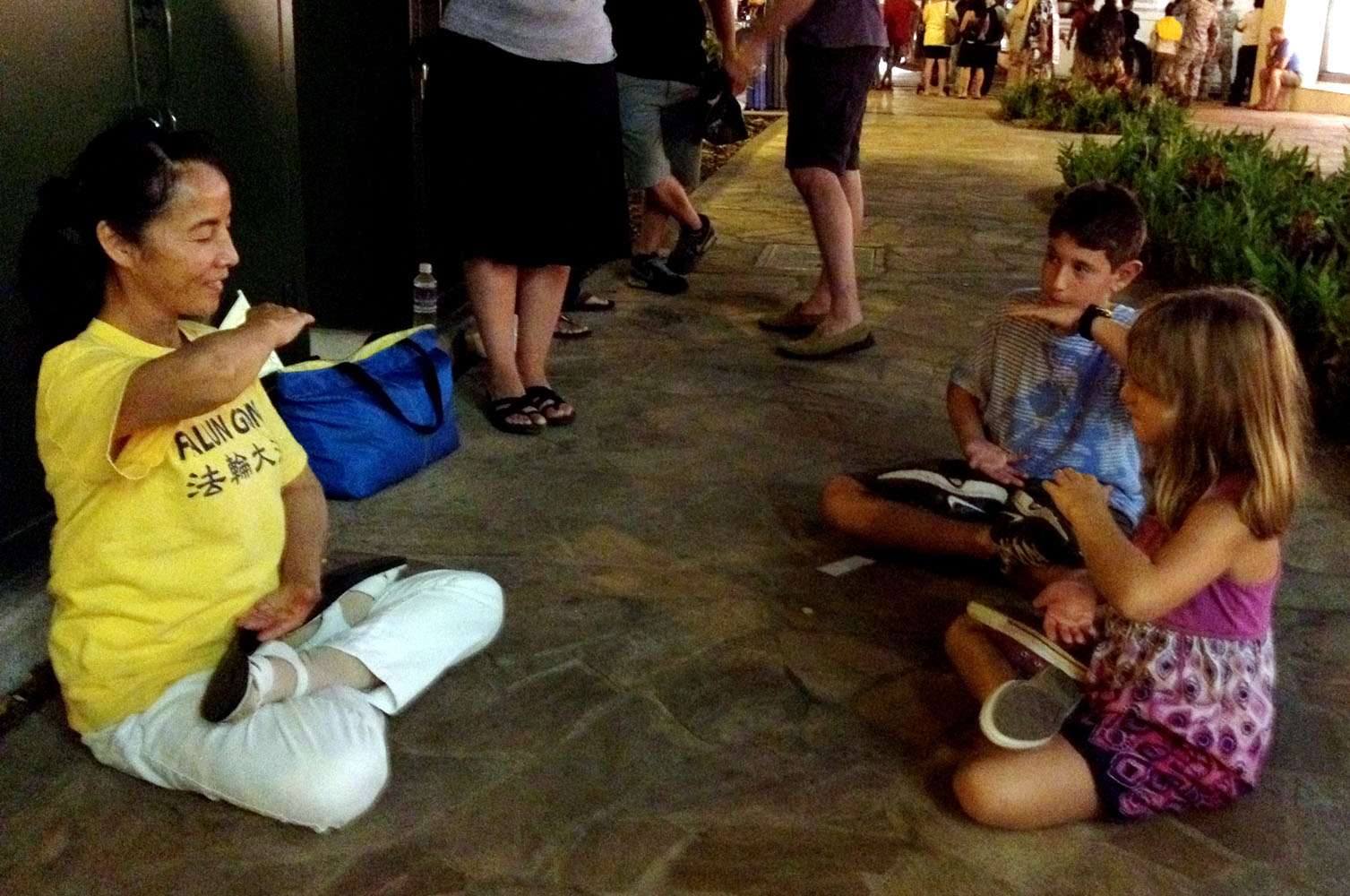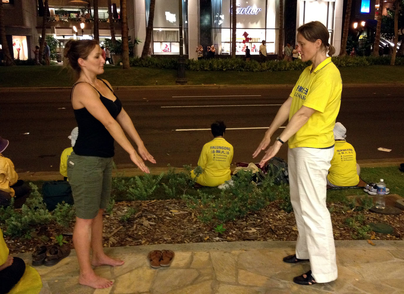 学员们在阿拉莫纳公园(Ala Moana Park)炼功时,女警Kathy在一旁静静看着,并悄声说到:“真是太优美、太平和了。这根本算不上抗议,什么话都不用说,在我眼前的这一切就是最强而有力的(powerful)真相,太震撼了!”